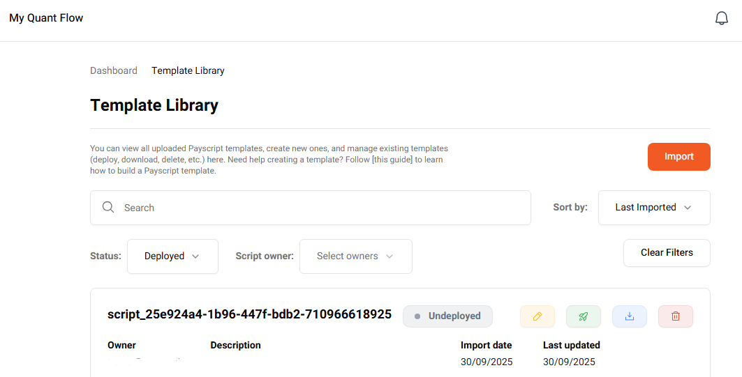 Once the script has been imported, it needs to be deployed. You can do this by clicking the green rocket button under the “ACTIONS” column. You should see the script’s value in the “Status” column change from “Undeployed” to “Deployed”.